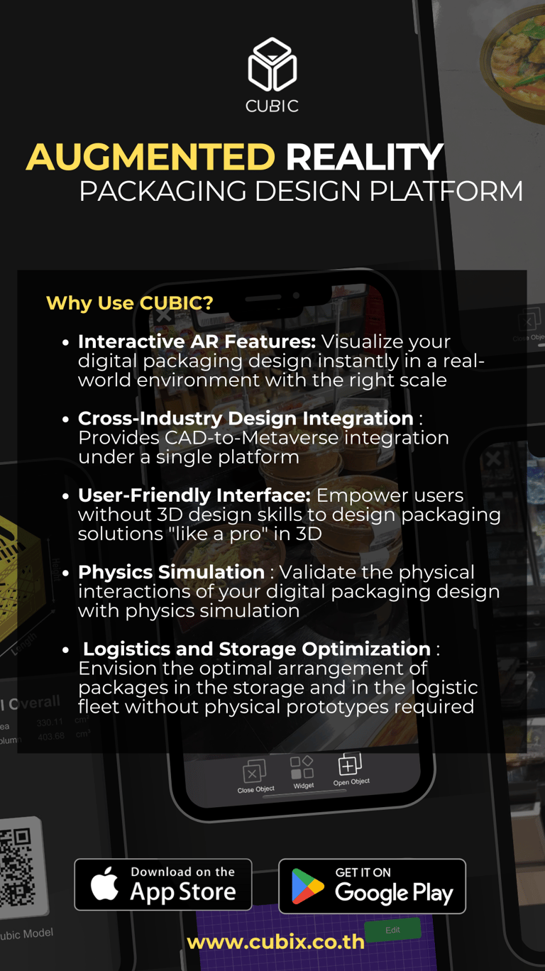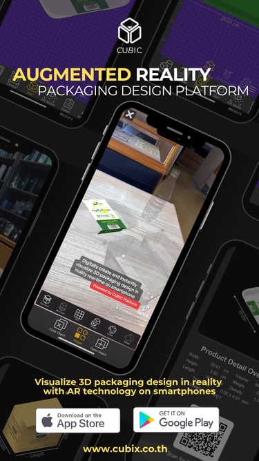 CUBIC is an all-in-one packaging design platform that not only helps everyone to professionally ideate creative packaging designs at a fingertip but also visualize designs in reality on mobile phones